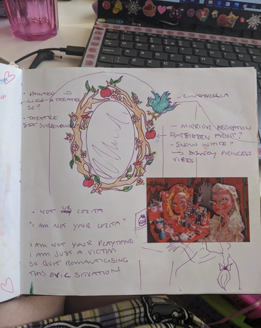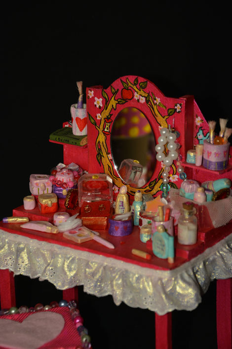 Balsa wood table, painted with a mirror. Tiny props made with clay and painted and mixed with found objects.